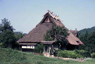 GIFU-KEN This deep mountain-side area has been designated a "world cultural-heritage site". Silkworm-rearing was done here too, but with the restraints of limited land, was by custom done in large houses as extended families, since there were laws prohibiting additional buildings. A large house may have accommodated 2 to 3 generations together under the same roof. Although wood was the only building material, houses in this area were even 4 to 5 stories high. These tall MINKA were called "GASHO-ZUKURI"(literally meaning "the style of a steep-rafter-roof mimicking the joining-of-hand-in-prayer"). Many think that this reverent acknowledgement has resulted in the most beautiful MINKA style in Japan. | ||||||